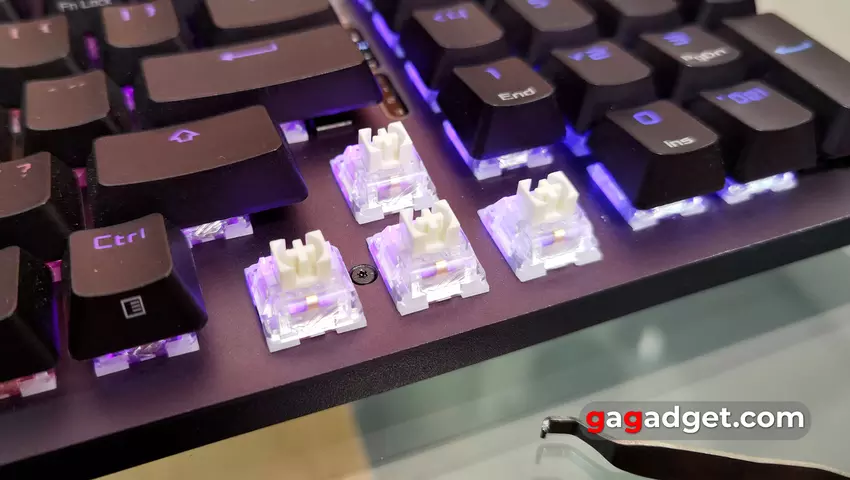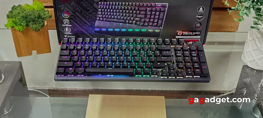 Die Tastatur verwendet neue, proprietäre mechanische ROG NX Snow-Schalter. Bei den ROG NX Snow handelt es sich um lineare Schalter, die für zusätzliche Stabilität mit einem gewandeten Schaft ausgestattet sind. Der volle Hub beträgt 3,6 mm, der Weg bis zur Betätigung 1,8 mm, die Anfangskraft 40 g, die Betätigungskraft 45 g und die maximale Kraft 53 g. Die Ressource der Schalter beträgt 70 Millionen Klicks. Sie sind ab Werk geschmiert und haben einen glatten, weichen und angenehmen Hub ohne Sand. Hot-Swapping wird unterstützt.