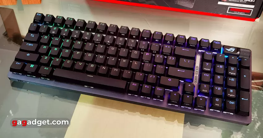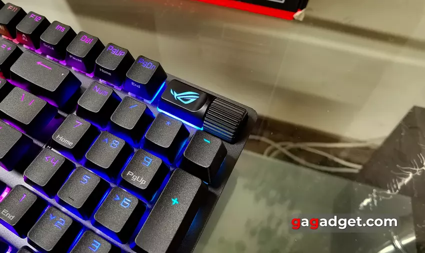 Zu den interessanten ungewöhnlichen Elementen gehören eine Multifunktionstaste mit einem beleuchteten ROG-Logo und ein Rad in der oberen rechten Ecke der Tastatur. Damit können Sie die Wiedergabe von Multimediadateien steuern, die Lautstärke einstellen und die Hintergrundbeleuchtung der Tastatur regeln. Etwas Ähnliches haben wir bereits beim ASUS ROG Azoth gesehen.