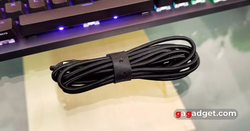 Das Type-C-Kabel ist 2 Meter lang und hat ein Geflecht und Gummibänder. Das Kabel ist ziemlich dick, aber nicht zu schwer, und es nimmt die gewünschte Position gut ein. Obwohl die Qualität des Kabels für eine Tastatur (insbesondere eine kabellose) nicht entscheidend ist.