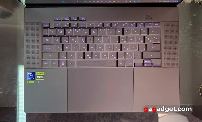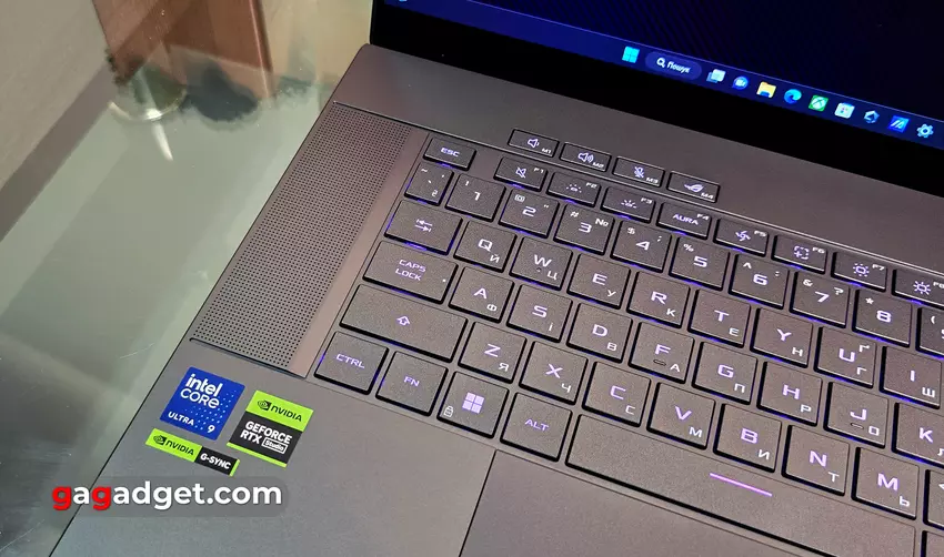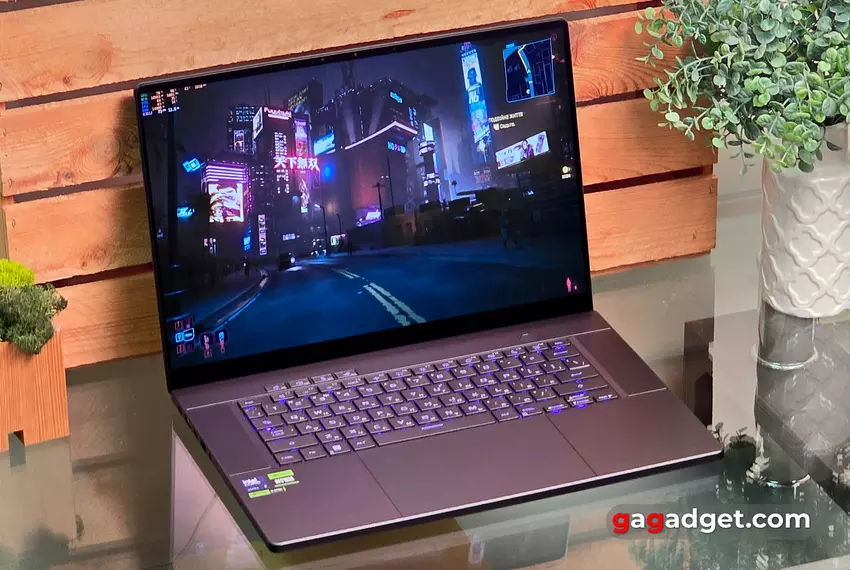 Kommen wir nun zu den Komponenten und der Leistung des ASUS ROG Zephyrus G16 (2024). Wie bereits erwähnt, zwang das dünne und leichte Gehäuse das Unternehmen dazu, einige Kompromisse einzugehen. Das gilt sowohl für den Prozessor als auch für die Grafikkarte. Normalerweise werden moderne Top-Gaming-Modelle von leistungsstarken Intel-Prozessoren der 14. Generation der HX-Serie angetrieben. In unserem Fall verwenden wir den neuen Intel Core Ultra der Meteor Lake-Familie, nämlich den Intel Core Ultra 9 185H, den wir kürzlich in unserem Test des ultraportablen ASUS Zenbook 14 OLED-Laptops (UX3405) vorgestellt haben. Zur Erinnerung: Der Prozessor verfügt über eine neue integrierte Grafik, die auf der Arc-Architektur basiert, sowie über einen separaten Neuroprozessor Intel AI Boost NPU, der für alle KI- und Machine-Learning-Operationen verwendet werden soll. Der Prozessor wird mit Intels Prozesstechnologie 4 (7 nm) gefertigt und verfügt über insgesamt 16 Kerne. 6 produktive Kerne arbeiten mit 2,3-5,1 GHz, 8 energieeffiziente mit 1,8-3,8 GHz und 2 ultra-effiziente Kerne mit 1-2,5 GHz. Es werden bis zu 22 Rechenthreads unterstützt. Der Arc-Grafikbeschleuniger hat 8 Xecoresmit einer Frequenz von bis zu 2,35 GHz. Die maximale Frequenz der Intel AI Boost NPU beträgt 1,4 GHz. Der TDP-Wert des Prozessors beträgt 28-45 W. RAM - 32 GB LPDDR5X 7467 (2x16 GB), arbeitet im Dual-Channel-Modus. Leider befindet er sich auf der Platine, so dass eine Erweiterung oder ein Austausch nicht möglich ist. Drahtlose Schnittstellen: Bluetooth 5.3 und schnelles Wi-Fi 6E (802.11ax) (Triple-Band) 2x2. Als diskreter Grafikbeschleuniger kommt das Spitzenmodell NVIDIA GeForce RTX 4090 Laptop zum Einsatz, allerdings mit einem eher bescheidenen TGP-Wert: bis zu 115W (95W + 20W Dynamic Boost). Die Frequenz liegt bei bis zu 1650 MHz und einem Boost auf 1700 MHz. Zum Vergleich: Der GeForce RTX 4090 Laptop im ASUS ROG Strix SCAR 18 (2024) hatte einen Standard TGP-Wert von bis zu 150 W und ROG Boost 175 W. Videospeicherkapazität 16 GB GDDR6. Das Notebook ist mit einem MUX-Switch-Multiplexer ausgestattet, um die Grafikkarte direkt mit dem Display zu verbinden und so die Latenz zu reduzieren und die Leistung zu erhöhen. Es unterstützt die NVIDIA Advanced Optimus-Technologie für die automatische MUX-Switch-Umschaltung.