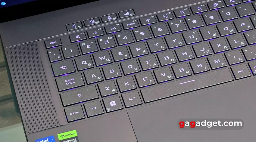 Das Notebook verwendet ein verstecktes Scharnierdesign, das sogenannte Stealth Hinge. Der maximale Öffnungswinkel des Laptops beträgt etwa 135°. Für den Fall, dass jemand wirklich 180° benötigt, erklärt ASUS, dass sie darauf verzichten mussten, um einige der Lüftungslöcher nicht zu verdecken. Ansonsten ist das Design von anderen ASUS-Modellen bekannt: Im aufgeklappten Zustand ist die Rückseite der Arbeitsfläche leicht über den Tisch angehoben. Dies trägt auch zu einer besseren Kühlung der Komponenten durch den größeren Raum darunter bei. Die Tastatur ist ganz typisch für ASUS-Ultraportables: Full-Size, ohne zusätzlichen Nummernblock. Oberhalb der Haupteinheit befinden sich vier zusätzliche Tasten, typisch für Gaming-Modelle. Sie sind für die Lautstärke, die Stummschaltung des Mikrofons und das Starten der proprietären Armoury Crate Anwendung zuständig. Sie können Makros für diese Tasten konfigurieren. Die Einschalttaste befindet sich ebenfalls oberhalb des Haupttastenblocks, und es wird äußerst schwierig sein, sie versehentlich zu drücken. Die obere Reihe der Funktionstasten ist verkleinert, ebenso wie der Navigationsblock. Beide Verschiebungen sind lang. Das Layout erfordert keine zusätzliche Eingewöhnungszeit.