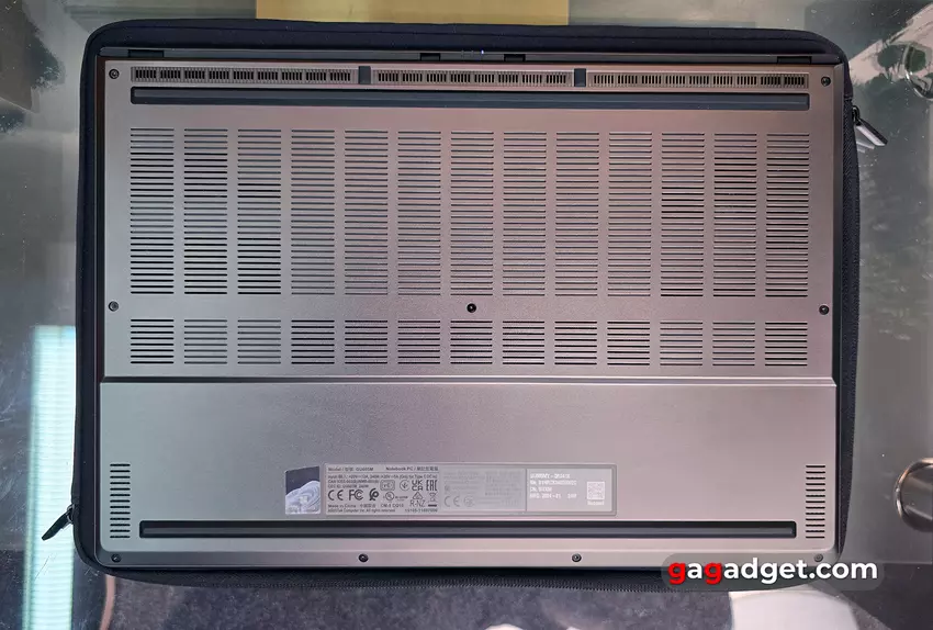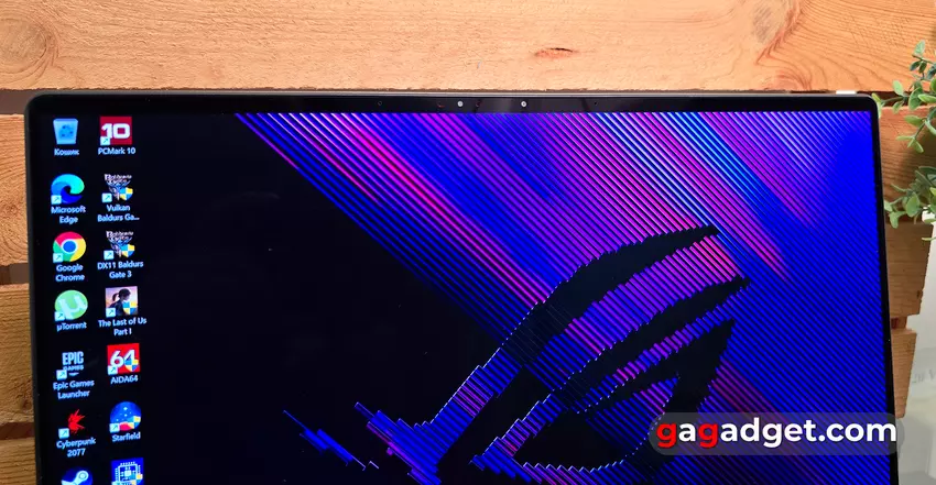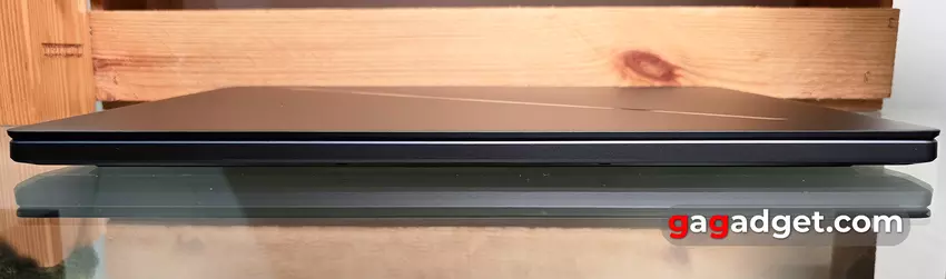 Alle Oberflächen des Notebooks haben eine angenehme matte Textur und nehmen kaum Fingerabdrücke oder Schmutz auf. Auf dem oberen Deckel befindet sich ein kleines Logo der ROG-Gaming-Linie sowie ein neues dekoratives Element für die Linie - Slash Lightning. Dabei handelt es sich um eine diagonale LED-Leiste mit 7 Zonen, die je nach Einstellung verschiedene Effekte erzeugen kann. Ich habe eine dunkelgraue Version getestet. Allerdings gibt es meiner Meinung nach auch eine interessantere weiße Version.