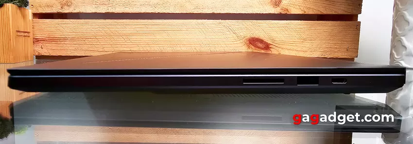 Alle Anschlüsse befinden sich an der Seite, die Rückseite ist für die Kühlung reserviert. Auf der linken Seite verfügt das Notebook über einen aktualisierten, proprietären, rechteckigen Netzteilanschluss, einen HDMI 2.1 FRL-Videoausgang, Thunderbolt 4 (mit DisplayPort-Unterstützung für integrierte Grafik und 100 W Power Delivery), USB Typ-A 3.2 Gen 2 in voller Größe sowie eine 3,5-mm-Audiobuchse.