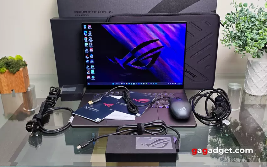 Die exzellente Ausstattung von ASUS-Top-Notebooks ist schon lange keine Überraschung mehr, so dass der große Karton des ASUS ROG Zephyrus G16 (2024) mit einem Haufen interessanter Dinge durchaus erwartet wurde. Neben dem Notebook selbst enthält das Paket eine Schutzhülle, eine Maus, ein 240-Watt-Netzteil, ein zusätzliches 100-Watt-Netzteil mit Type-C und eine Dokumentation. Die Schutzhülle ist schwarz. Sie hat ein interessantes Design und ziemlich dicke weiche Wände, die das Notebook gut schützen. Besonders erfreulich ist, dass wir bereits in einer Zeit leben, in der ein leistungsstarkes 16-Zoll-Notebook in einer Schutzhülle problemlos in ein Standard-Laptopfach in einem Rucksack passt.