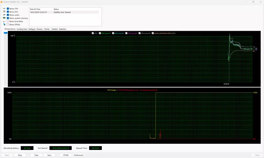 Der AIDA64-Stresstest hat gezeigt, dass sich die Komponenten bei maximaler Belastung zunächst auf 105° erwärmen und eine Drosselung bei etwa 20% zu beobachten ist. Danach bleibt die Temperatur im Bereich von 75-80° und das Notebook arbeitet stabil. Der Geräuschpegel bei maximaler Belastung ist mehr als akzeptabel, andere Modelle sind in der Regel lauter. Wenn das Notebook nicht ausgelastet ist, schaltet das Kühlsystem manchmal in den passiven Modus, was aber selten vorkommt. Die Tastatur und der größte Teil der Arbeitsfläche bleiben unter Last kühl, da ein Teil der kalten Luft durch die Tastatur angesaugt wird.
