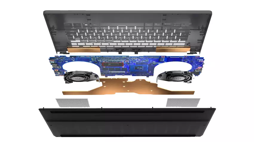 Das ROG Intelligent Cooling System im ASUS ROG Zephyrus G16 (2024) umfasst einen massiven Kühlkörper, eine große Verdunstungskammer und zwei Arc Flow Lüfter der 2. Thermal Grizzly Flüssigmetall wird traditionell als thermische Schnittstelle verwendet.