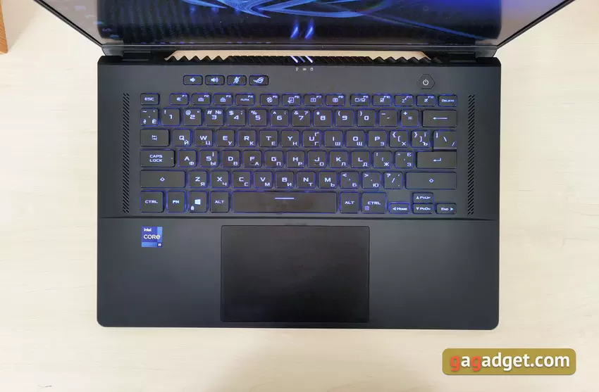Trotz der Tatsache, dass es sich um ein 16-Zoll-Modell handelt, haben sich die Ingenieure entschieden, die Tastatur ohne einen zusätzlichen Ziffernblock zu installieren. Das ist für das Spielmodell aber nicht kritisch. Das Layout selbst ist fast Standard: die obere Reihe der Funktionstasten ist in der Höhe leicht reduziert, die beiden langen Shift-Tasten und eine einstöckige Enter-Taste. Der Pfeilblock ist leicht vom Rest der Tasten abgesetzt, hat aber eine geringere Höhe. Die Lautsprechergitter sind an den Seiten der Tastatur sichtbar. Von den zusätzlichen Tasten gibt es separate Tasten zum Einstellen der Lautstärke, zum Stummschalten des Mikrofons und zum Starten des Dienstprogramms Armory Crate. Sie befinden sich oberhalb des Hauptblocks der Tastatur. In der oberen rechten Ecke, oberhalb der Tastatur, befindet sich eine Power-Taste, die mit einem Fingerabdruckscanner kombiniert ist.