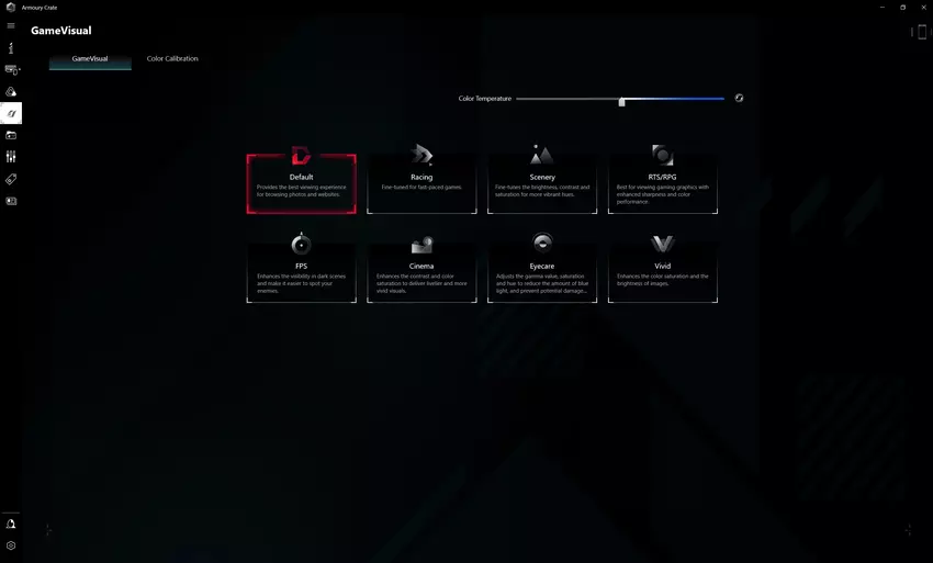 In Armory Crate können Sie eine der vorhandenen Bildvoreinstellungen auswählen und die Farbtemperatur manuell anpassen. Bei Bedarf kann das Display auch selbst kalibriert werden, um eine genauere Farbwiedergabe zu erreichen: