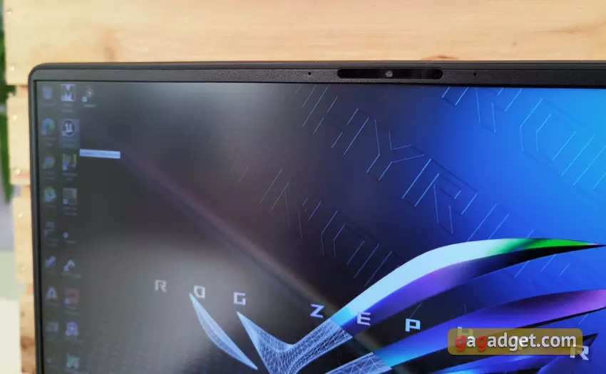 Die Rahmen sind sehr dünn um den gesamten Umfang des Displays. Laut ASUS nimmt er 94 % der gesamten Deckelfläche ein. Dadurch war es möglich, einen 16-Zoll-Bildschirm in ein Notebook mit Standardabmessungen für 15,6-Zoll-Modelle einzubauen. Es gibt eine Webcam, die sich an der üblichen Stelle befindet. In der Nähe befinden sich Mikrofone.