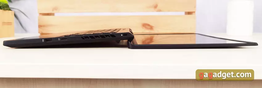 Das Notebook ist kompakt und leicht, natürlich, in seiner Kategorie: 35,5x24,3x1,99 cm, 1,9 kg. Es gibt keine Probleme beim Transport: Es passt in jedes Standard-Laptopfach. Außerdem: Dank der Power-Delivery-Unterstützung kann man sich für einfache Office-Aufgaben ein kompakteres Netzteil mit Type-C besorgen und muss nicht jedes Mal ein großes 240-W-Komplettnetzteil mitschleppen.