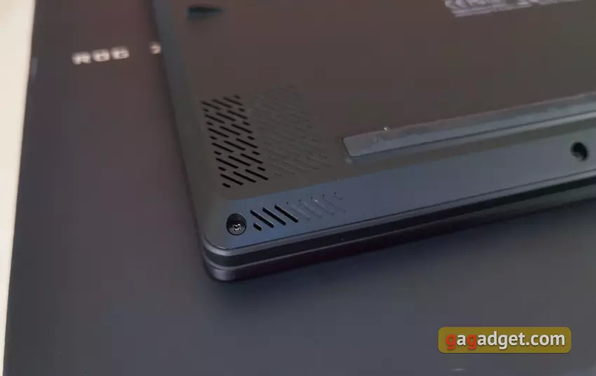 An der Unterseite des Laptops befinden sich Lautsprecher, Lüftungsöffnungen und zwei breite Gummibänder für die Stabilität. Gleichzeitig ist, traditionell für ASUS-Gaming-Modelle, die Möglichkeit einer relativ einfachen Aufrüstung gegeben. Eine der Ecklamellen der unteren Abdeckung hat ein spezielles Design. Wenn man sie abschraubt, hebt sich der Deckel, um ihn anschließend leichter öffnen zu können. Neben dem Arbeitsspeicher können Sie auch die Laufwerke aufrüsten. Es gibt zwei Steckplätze im Notebook: einer unterstützt M.2 NVMe PCIe 4.0 x4 Laufwerke, der zweite - PCIe 3.0 x4.