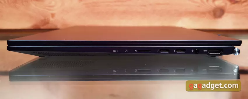Das Notebook hat ein vertrautes keilförmiges Profil, und ausnahmsweise kann man ein aktualisiertes rundes silbernes Scharnierprofil sehen. Es gibt nicht allzu viele Anschlüsse, obwohl alles Wesentliche vorhanden ist. Auf der rechten Seite des Laptops befinden sich einige Anzeigen, ein MicroSD-Kartenleser, zwei Thunderbolt 4 (mit DisplayPort- und Power Delivery-Unterstützung), ein 3,5-mm-Kopfhörer- oder Headset-Anschluss und HDMI 2.0b.
