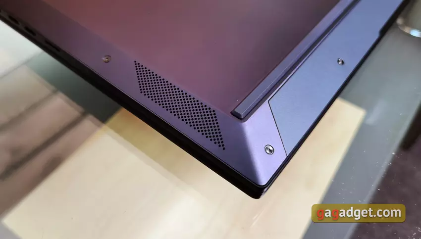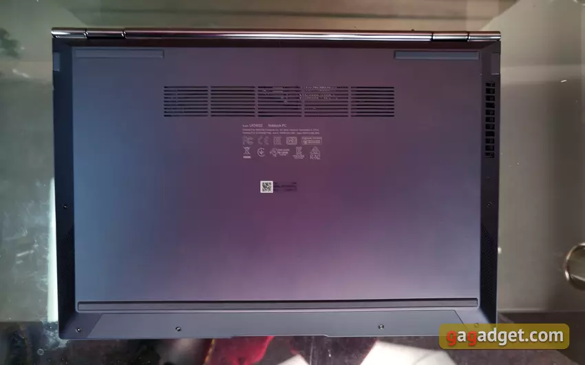 Die Unterseite des Laptops ist absolut typisch. Große Gummifüße, damit das Notebook nicht auf der Oberfläche verrutscht, Lüftungslöcher und viele Schrauben, die den unteren Deckel halten. Die Vorderseite und die Seiten des Notebooks haben abgeschrägte Kanten. An den Seiten befinden sich Lautsprecher und an der Vorderseite ein Kunststoffeinsatz. Offenbar ist er für die Antennen der drahtlosen Schnittstelle gedacht.