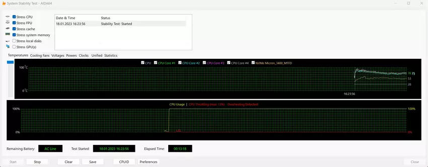 Das Kühlsystem des ASUS Zenbook 14 OLED (UX3402) ist selbst bei maximaler Auslastung recht leise, aber durchaus effizient. Im AIDA64-Stresstest erwärmen sich die Komponenten bei maximaler Last zunächst auf etwa 95° und der Prozessor verliert an Leistung, was zu einem Throttling von 13% führt. Nach der Anpassung des CO liegt die Temperatur der Komponenten bei etwa 75°, und das Notebook arbeitet stabil. Das Gehäuse heizt sich kaum auf.