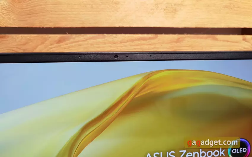 Der Hersteller gibt an, dass der Bildschirm 90 % der Oberseite einnimmt. Die Ränder sind wirklich sehr dünn. Oberhalb des Bildschirms befinden sich zwei Mikrofone und eine Webcam mit einer Statusanzeige. Interessanterweise können verschiedene Konfigurationen des ASUS Zenbook 14 OLED (UX3402) sowohl HD- als auch FullHD-Kameras haben. In unserem Fall hat sie eine FullHD-Auflösung und nutzt die Echtzeit-Technologie zur dreidimensionalen Rauschunterdrückung (3DNR).