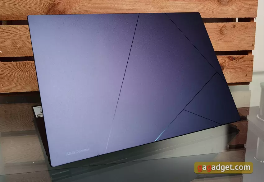 Alle aktuellen Zenbooks haben ein aktualisiertes Design erhalten, obwohl einige grundlegende Merkmale unverändert bleiben. Das Gehäuse besteht nach wie vor aus Metall, und die Dicke und das Gewicht sind recht gering. Wir haben die blaue Version des ASUSZenbook 14 OLED (UX3402)getestet , aber es gibt auch ein ungewöhnliches Hellgrün (Aqua Celadon). Der obere Deckel des Laptops hat kein konzentrisches Muster mehr, wie es früher bei Zenbooks üblich war. Stattdessen hat er ein Muster in Form von Linien, die das neue ASUS-Logo bilden - einen stilisierten Buchstaben A. Laut ASUS war die Inspirationsquelle für das neue Design die traditionelle japanische Keramikreparaturtechnik namens kintsugi. Es sieht wirklich stilvoll aus und hat eine schöne Oberfläche. Aber Fingerabdrücke bleiben sofort und in großer Zahl zurück. Das gilt auch für die interne Arbeitsfläche.