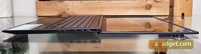 Auf der Rückseite befindet sich nur ein breites Scharnier, das den größten Teil der Breite des Notebooks einnimmt. Die Vorderseite hat den üblichen Deckelausschnitt. Es gibt keine weiteren funktionalen Elemente.