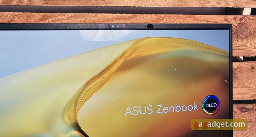 Die Ränder um den Bildschirm herum sind dünn, vor allem an den Seiten. Der Bildschirm nimmt 89 % der Oberfläche ein. Oberhalb des Bildschirms befinden sich eine Webcam mit Anzeige, eine Infrarotkamera zur Identifizierung des Besitzers, zwei Mikrofone, ein Lichtsensor für die automatische Helligkeitseinstellung und ein RGB-Sensor für die automatische Anpassung der Farbtemperatur des Displays. Die Webcam hat eine FullHD-Auflösung und unterstützt die ASUS AiSense Bildverbesserung. Sie umfasst Hintergrundunschärfe, Beleuchtungskorrektur, Augenrichtungskorrektur, Bewegungsverfolgung, Filter und 3D-Rauschunterdrückung (3DNR) in Echtzeit.