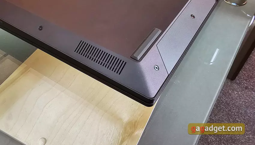 Die Unterseite verfügt über zahlreiche Lüftungslöcher und Gummifüße. An den abgeschrägten Seitenkanten befinden sich Stereolautsprecher. Die untere Abdeckung kann durch Lösen von 9 Schrauben abgenommen werden. Dies kann notwendig sein, um das Kühlsystem zu reinigen oder die SSD auszutauschen. Der Arbeitsspeicher ist auf der Platine verlötet, so dass Sie seine Kapazität nicht erhöhen können.
