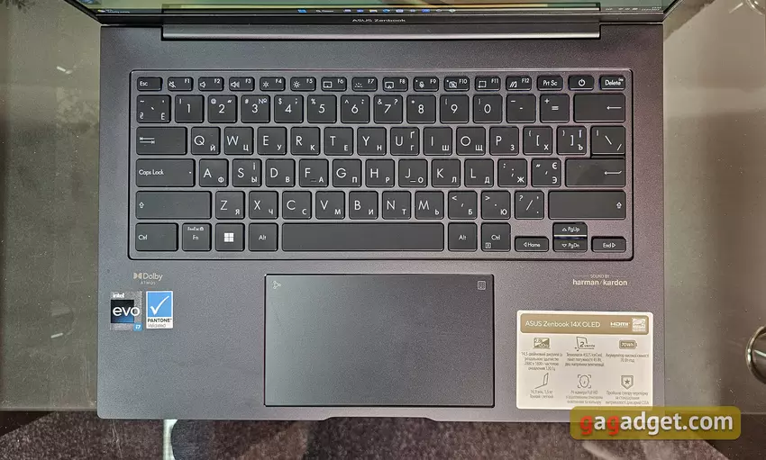 Das Interessanteste findet sich im Inneren des Notebooks. Es hat einen neuen Intel Raptor Lake Prozessor der 13. Generation. In unserem Fall handelt es sich um einen Intel Core i7-13700H. Normalerweise werden Prozessoren der H-Serie in "massiveren" tragbaren Workstations und Gaming-Laptops verwendet, während ultraportable Modelle wie das ASUS Zenbook 14X OLED (UX3404) weniger produktive, energieeffizientere Prozessoren der U- oder P-Serie erhalten. Der Intel Core i7-13700H wird mit dem Intel 7-Prozess hergestellt, hat eine TDP von 45 W und einen Cache von 24 MB. Die Konfiguration der Kerne ist ähnlich wie bei den letztjährigen Prozessoren der gleichen Stufe. Nämlich: 6 produktive Kerne mit einer Frequenz von 2,4-5 GHz und 8 energieeffiziente Kerne mit einer Frequenz von 1,8-3,7 GHz. Es gibt Unterstützung für Multi-Thread-Computing: bis zu 20 Threads. Es gibt 16 GB LPDDR5-4800 RAM. Er ist auf die Platine gelötet, so dass Sie die Kapazität nicht erhöhen können. In dieser Konfiguration gibt es keinediskrete Grafikkarte, sondern nur eine eingebaute Intel Iris Xe. Sie hat 96 Exekutiveinheiten, und die maximale Frequenz kann 1500 MHz erreichen. Es gibt eine leistungsstärkere Laptop-Konfiguration mit einem Intel Core i9, NVIDIA GeForce RTX 3050 Laptop 4GB Grafik und 32GB RAM. Drahtlose Schnittstellen: Wi-Fi 6E (802.11ax) und Bluetooth 5.2.