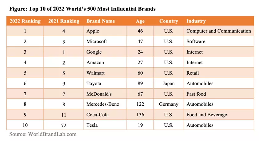 Das Forschungsunternehmen World Brand Lab hat die Ergebnisse des Jahres 2022 zusammengefasst und eine Rangliste der 500 einflussreichsten Marken der Welt erstellt.