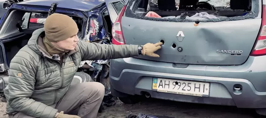 Das Video beginnt mit einer Demonstration eines Friedhofs mit Zivilfahrzeugen, die an einen Ort in Bucha gebracht wurden. Pavel macht auf die Löcher der 30-mm-Kanone in der Tür des Renault Sandero (in Europa wird das Auto als Dacia Sandero verkauft) und ihre Genauigkeit aufmerksam, obwohl die Schüsse aus großer Entfernung abgefeuert wurden.