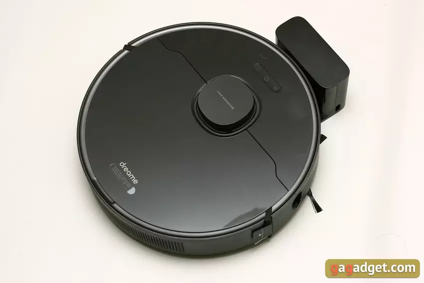 Dreame Bot L10 Pro ähnelt den meisten anderen Roboterstaubsaugern. Große runde "Unterlegscheibe" auf Rädern. Das Gehäuse ist aus Kunststoff, schwarz, die Oberseite ist glänzend, alles andere ist matt. Über der glatten Oberfläche des Staubsaugers erhebt sich ein „Kommandoturm“ mit einem Laser-Entfernungsmesser. Ein Teil dieser Oberfläche lässt sich wie ein Deckel nach hinten klappen, um den Zugang zum Mülleimer zu öffnen. Auf der anderen Seite befindet sich ein Bedienfeld mit drei Tasten, die für den manuellen Start der allgemeinen und lokalen Reinigung sowie für die Rückkehr zur Basis verantwortlich sind.