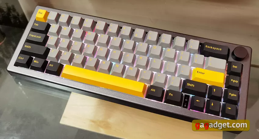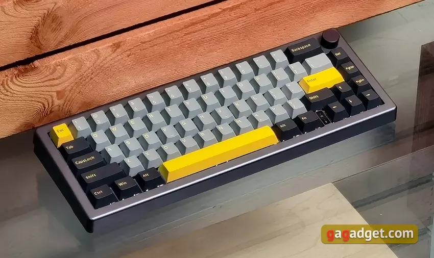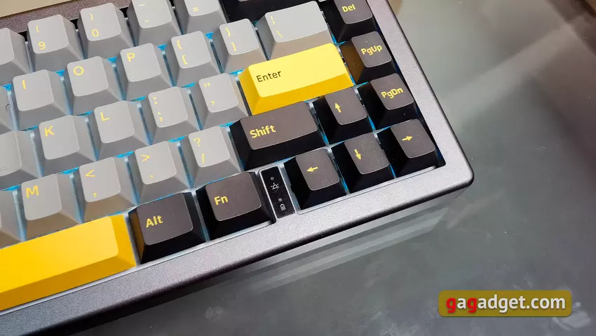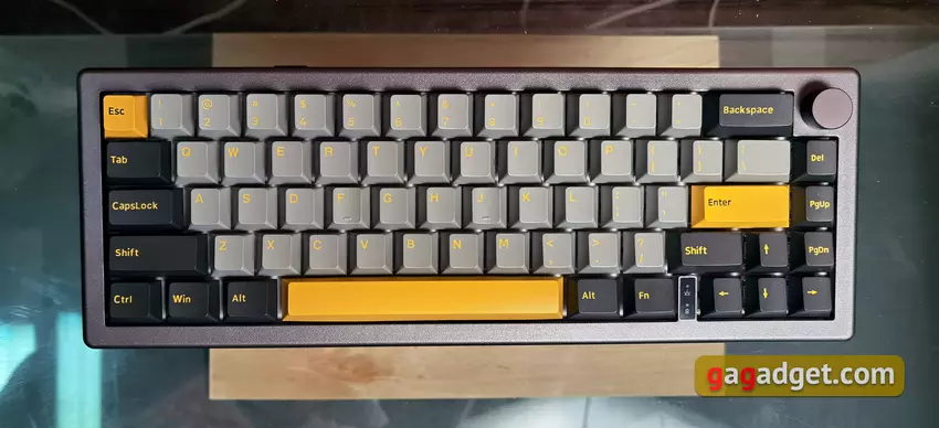 Die Epomaker EK68 ist eine 65%-Tastatur mit 66 Tasten und einem Drehknopf in der oberen rechten Ecke, der für die Lautstärkeregelung beim Scrollen und die Stummschaltung beim Drücken zuständig ist. Sie hat einen klaren und angenehmen Bildlaufschnitt. Neben dem Fehlen eines zusätzlichen Nummernblocks weist die Tastatur einige weitere wichtige Merkmale auf. Sie verfügt nicht über die F-Reihe sowie die Tasten PrtScr, Scroll Lock, Pause, Home, End, ~, Insert. Alle diese Tasten sind durch Kombinationen mit Fn verfügbar. Zum Beispiel die Tasten F - Fn + Reihe von 1 bis +. Der Navigationsblock ist nicht von den anderen Tasten getrennt, weshalb die rechte Umschalttaste etwas kürzer ist. Und die Tasten Del, PgUp und PgDn befinden sich senkrecht über dem rechten Pfeil. Und zwischen dem linken Pfeil und Fn befinden sich zwei LEDs. Es gibt keine separate CapsLock-Anzeige, aber die Anzeige wird durch die Hintergrundbeleuchtung der Taste realisiert: Sie ändert ihre Farbe. Es dauert also eine Weile, bis man sich an dieses Layout gewöhnt hat. Aber Kenner solch kompakter Modelle wissen in der Regel, worauf sie sich einlassen. Bei Spielen sollte es keine Probleme geben: alle notwendigen Tasten sind vorhanden.