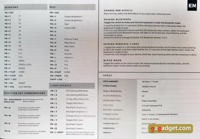 Die Epomaker EK68 wird in einer blauen Pappschachtel mit einer schematischen Abbildung und grundlegenden technischen Informationen geliefert. Die Verpackung ist recht interessant. Neben der Tastatur selbst enthält der Karton ein Type-C-Kabel zum Aufladen und für die kabelgebundene Verbindung, einen Miniatur-USB-Sender, zusätzliche Esc-, Space-, Enter- und Backspace-Tastenkappen, ein Werkzeug zum Entfernen von Tastenkappen und Schaltern, drei Ersatzschalter und ein englisches Handbuch. Sie sollten es nicht vernachlässigen: Die meisten Tastatureinstellungen werden über Tastenkombinationen vorgenommen.