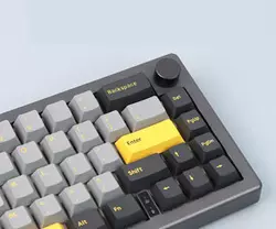 Die Epomaker EK68 hat ein klassisches Design mit einer gemeinsamen Abdeckung, so dass die mechanischen Schalter nicht sichtbar sind. Die Tastatur ist sehr kompakt und nimmt nicht viel Platz in Anspruch, aber das Layout ist sehr ungewöhnlich, so dass es etwas gewöhnungsbedürftig ist. Das Modell ist in mehreren Farbvarianten erhältlich: in ruhigem Schwarz und Grau, in Schwarz und Lila sowie in Schwarz und Grau mit Gelb, wie wir es im Test haben. Es sieht ziemlich originell und ungewöhnlich aus. Ob es Ihnen gefällt oder nicht, ist eine individuelle Angelegenheit. Alle Designelemente sind matt, so dass sich auf der Tastatur keine Fingerabdrücke festsetzen können.