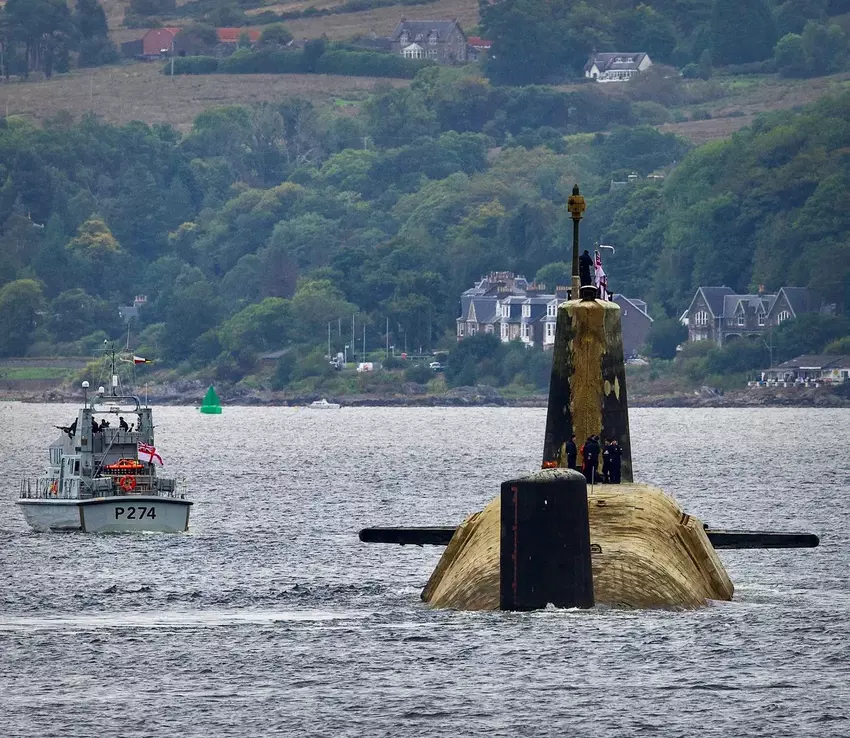 Die Bilder wurden bei der Rückkehr des Atom-U-Boots zum Marinestützpunkt Clyde in Schottland aufgenommen. Die britische Royal Navy verfügt über insgesamt vier U-Boote der Vanguard-Klasse, die mit ballistischen Interkontinentalraketen vom Typ Trident II (D5) ausgestattet sind, die nukleare Sprengköpfe tragen können.