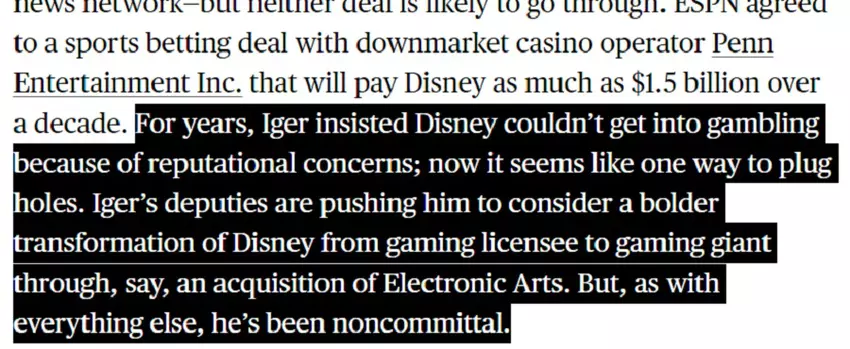 Zum jetzigen Zeitpunkt zögert Iger noch, den Schritt zu wagen, aber angesichts des Tempos der Videospielindustrie und des Geldes, das sie einbringt, könnte Bob Iger jederzeit ein Angebot machen, das EA nicht ablehnen kann.