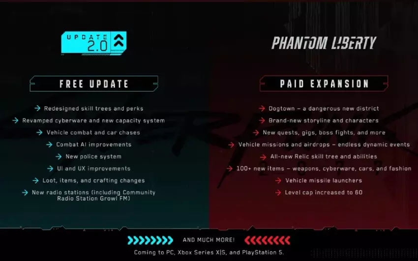 Eine Woche vor der Veröffentlichung von Phantom Liberty erhielt Cyberpunk 2077 ein großes Update 2.0, das einige Elemente des Spiels veränderte. Es würde einen separaten Artikel erfordern, über jedes einzelne Element zu berichten, daher werde ich kurz die wichtigsten erwähnen, die das Erweiterungspaket betreffen.