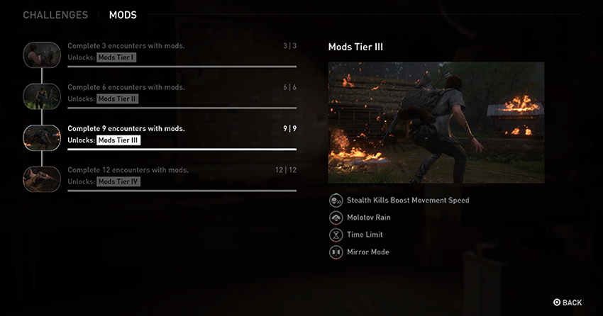 Wenn Sie den Level erfolgreich abgeschlossen haben, kehren Sie zum Hub zurück und wiederholen das vorherige Verfahren. Nun wählt man das Level erneut aus und geht in den Capture-Modus mit einem Modifikator, der die Zeit verlangsamt, wenn man den Gegner am Kopf tötet. Im Verlauf des Levels stellen Sie fest, dass Sie eine neue Herausforderung für Ellie erfüllen können: Töten Sie 4 Gegner mit einem Molotow-Cocktail und schalten Sie einen neuen Skin frei. Du schließt die Herausforderung erfolgreich ab und gewinnst.