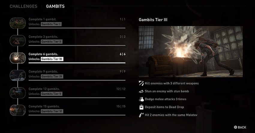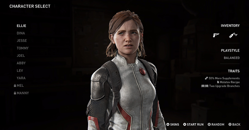 Für Ellie gibt es zum Beispiel 4 Herausforderungen: zwei Levels gewinnen (wodurch Dina freigeschaltet wird), einen Fertigkeitszweig vollständig aufwerten, 4 Gegner mit einem Molotow-Cocktail töten und alle möglichen Waffen in einem Durchgang sammeln. Die letzten drei Herausforderungen schalten verschiedene Kostüme für die Heldin frei.