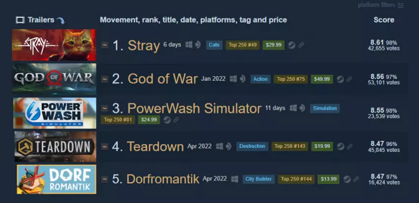 • Abgerundet werden die Top drei durch PowerWash Simulator - einen Hochdruckreinigungssimulator. Das Projekt erhielt 8,55 Punkte (23.539 Bewertungen, davon 98 % positiv).