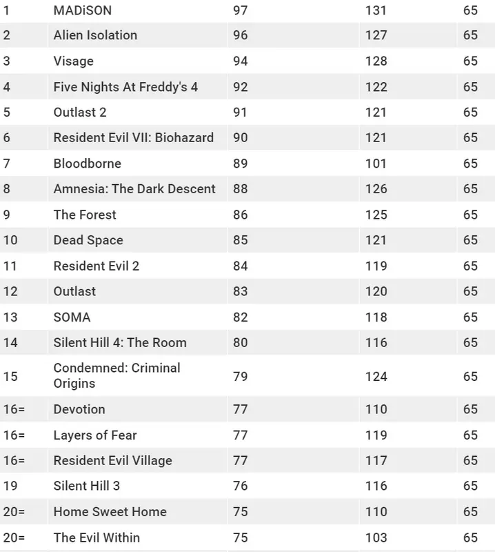 Bei dem Experiment stellte sich heraus, dass das schrecklichste Spiel das Horrorspiel MADiSON des Studios Bloodious Games war. Den zweiten Platz in der Horrorwertung belegte Alien: Isolation, gefolgt von Visage und Five Night at Freddy's 4.