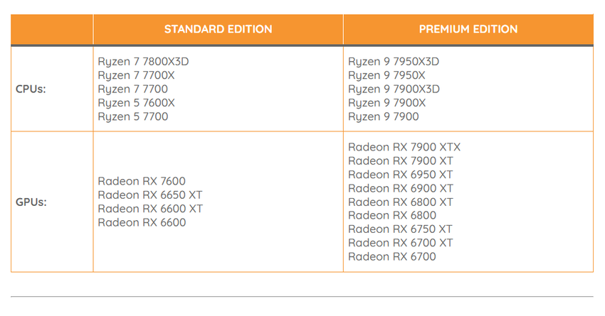 Die offizielle Seite vonAMD Taiwan wurde mit Informationen über das kommende Bundle aktualisiert, das, wie sich herausstellte, neben der oben genannten Hardware auch Radeon 6000 GPUs enthalten wird. Das Bundle wird in zwei Versionen erhältlich sein, die jeweils einen Code zum Herunterladen des Spiels zusammen mit Ryzen-Prozessoren und Radeon-Grafikprozessoren enthalten, wobei in jeder Version verschiedene Varianten für beide verfügbar sind. Die vollständige Liste der CPU- und GPU-Optionen für beide Versionen finden Sie unten: