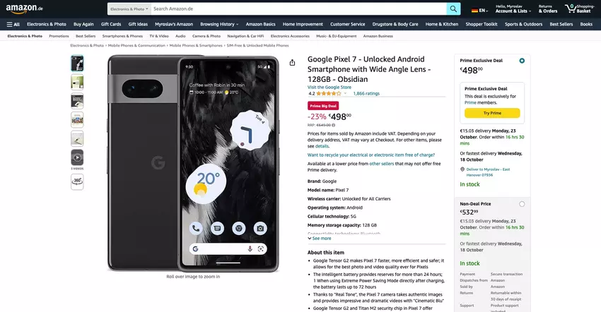 Wir sprechen über das Pixel 7. Das Smartphone ist in der Farbe Obsidian erhältlich und kostet check price on amazon. Dank des Prime-Abonnements kann der Preis um weitere 35 € gesenkt werden.