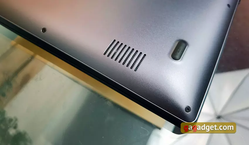 An der Unterseite des Laptops befinden sich Lüftungslöcher, Gummifüße, die ein Verrutschen verhindern, und Stereolautsprecher. Die untere Abdeckung kann durch Entfernen der 10 Schrauben am Umfang entfernt werden. Obwohl in der Tat können Sie nur die einzige SSD von M.2-Format zu ersetzen. Es gibt keinen zusätzlichen Steckplatz für ein zweites Laufwerk. Ebenso wenig wie ein RAM-Upgrade oder der Austausch der Netzwerkkarte.