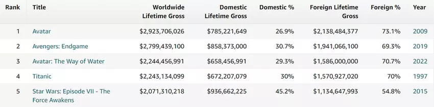 Damit konnte Teil 2 einen anderen James Francis Cameron-Kultfilm, Titanic, überholen und ist nun der dritterfolgreichste Film der Kinogeschichte, nur noch hinter dem ersten Avatar-Film (2,92 Milliarden Dollar) und Avengers: The Endgame (2,799 Milliarden Dollar).