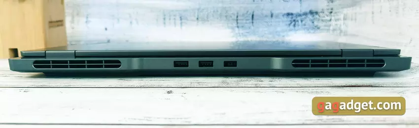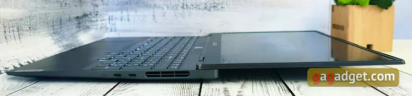 Und nun zu den Nachteilen des Entwurfs. Auf der rechten Seite befinden sich zwei USB Typ-C 3.1 Gen 2 Anschlüsse mit DisplayPort und Power Delivery Unterstützung. Und das sind auch schon alle verfügbaren Anschlüsse für den Anschluss eines externen Monitors in einem, ich erinnere mal, Gaming-Laptop. Und wenn Sie keine Probleme mit dem Anschluss eines externen Monitors haben, müssen Sie wahrscheinlich einen Adapter oder ein entsprechendes, nicht sehr weit verbreitetes Kabel kaufen, um ihn an ein Fernsehgerät anzuschließen. Auf der gleichen Seite befindet sich die Novo-Taste in dem kleinen Loch, mit der Lenovo OneKey Recovery zum schnellen Zurücksetzen des Laptops gestartet wird. Die Belüftungsdüsen haben die gleiche Größe wie beim Vorgängermodell, unterscheiden sich aber dekorativ: Sie sind an den Seiten abgerundet.
