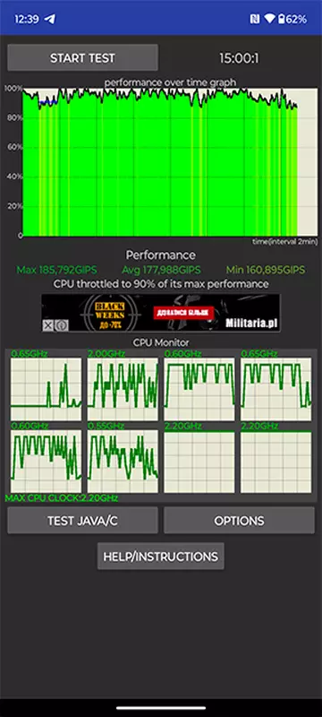 Der Prozessor erweist sich als ziemlich kalt: Im Stresstest CPU Throttling Test kann die Leistung nach 15 Minuten maximaler Belastung auf nur 90 % fallen. Das Smartphone-Gehäuse bleibt kalt.