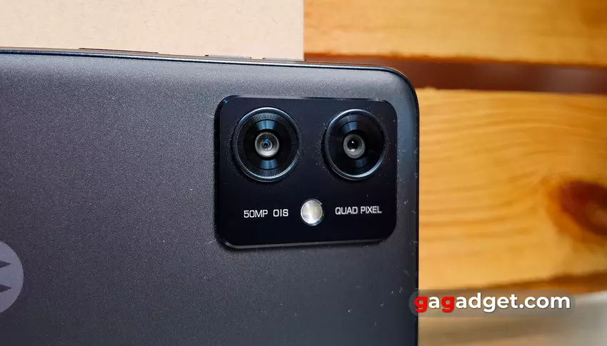 Das rückseitige Kameramodul ist typisch für die aktuellen Motorola-Modelle: ein Rechteck mit abgerundeten Ecken, das zwei Linsen, einen Blitz und grundlegende Kamerainformationen enthält. Es ragt nicht so weit über die Rückabdeckung hinaus wie bei teureren Modellen.