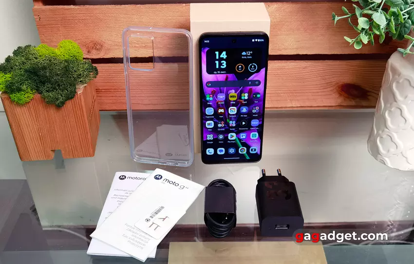 Das Motorola Moto G54 Power Edition hat die typische Verpackung und Lieferung für moderne Smartphones des Unternehmens. Es unterscheidet sich von teureren Modellen nur durch das Fehlen einer Duftbox. Neben dem Smartphone enthält der Karton einen transparenten Silikonschutz, ein 33-Watt-Netzteil, ein Type-C-Kabel, einen Tray-Clip und eine Reihe von Unterlagen.