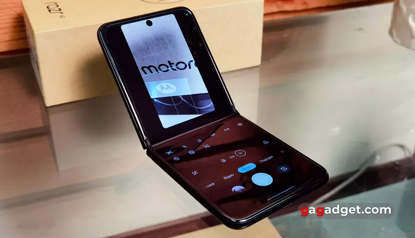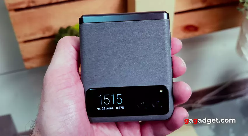 Alle anderen Funktionen eines Smartphones mit diesem Formfaktor sind bereits bekannt. Dies ist die Möglichkeit, Fotos und Videos in einer halbgeklappten Position aufzunehmen, indem man das Smartphone irgendwo hinlegt. Das heißt, es ist kein Stativ erforderlich, und ein Selbstporträt wird mit einer Geste aufgenommen.