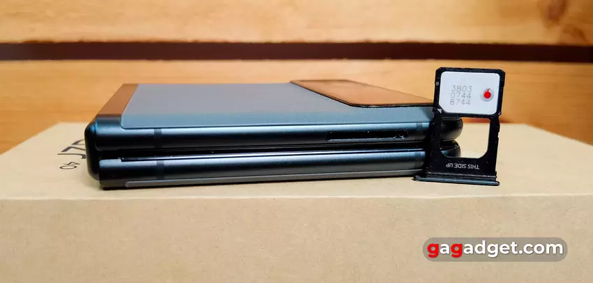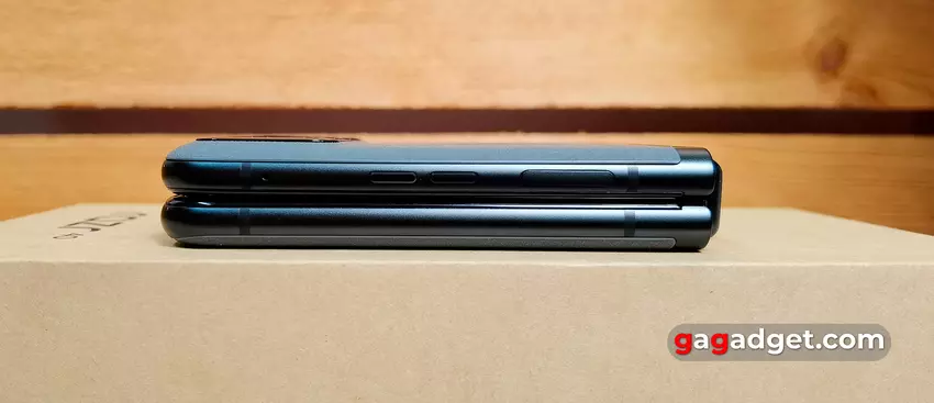 Der Rahmen des Smartphones ist aus Aluminium der Serie 7000 gefertigt und hat eine matte Oberfläche. Im geschlossenen Zustand sind die Hälften fest zusammengedrückt und weisen keine Lücken auf. Die Funktionselemente befinden sich an den gleichen Stellen wie beim älteren Modell. Auf der rechten Seite des Smartphones befindet sich eines der zusätzlichen Mikrofone, separate Lautstärketasten und eine große Einschalttaste, die auch als Fingerabdruckscanner dient. An die Platzierung der Tasten muss man sich, wie bei allen Clamshells, gewöhnen: Sie sind etwas höher platziert als bei herkömmlichen Smartphones.