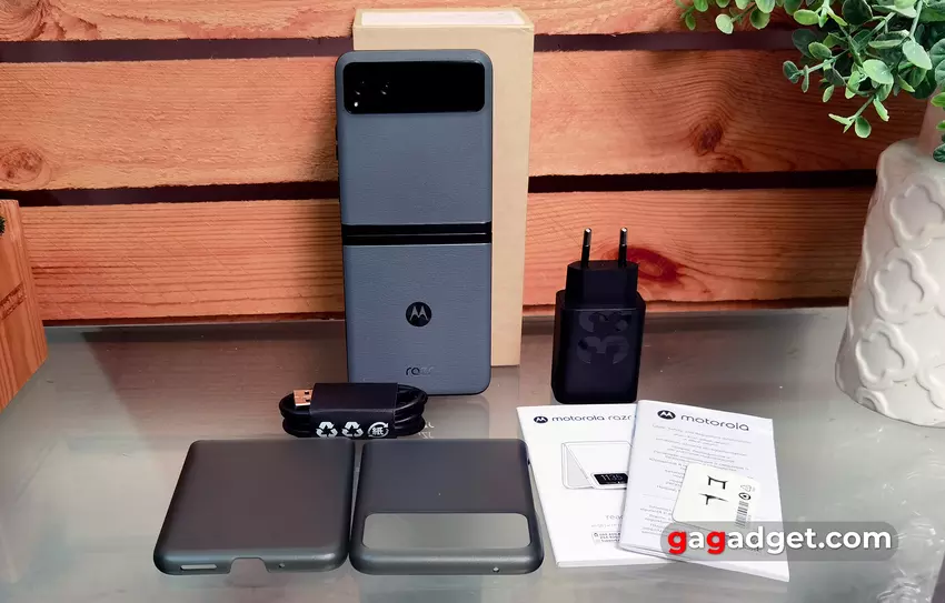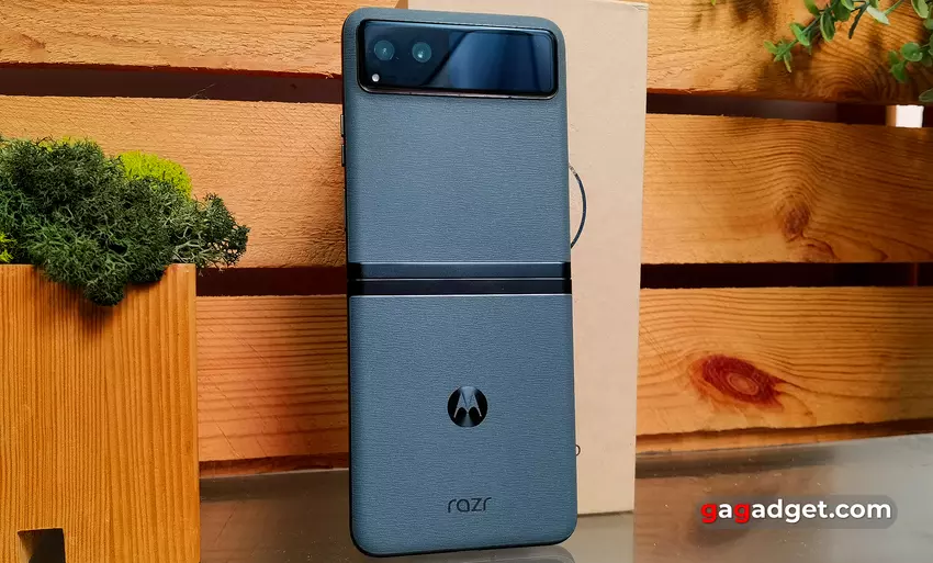 Strukturell ist das Motorola Razr 40 dem älteren Modell Razr 40 Ultra sehr ähnlich, aber es gibt einige bedeutende Unterschiede. Der erste und wichtigste ist die Größe und Funktionalität des externen Displays. Beim Motorola Razr 40 beträgt seine Diagonale nur 1,5 Zoll und befindet sich unter einem gemeinsamen Gorilla Glass Victus mit einer Dual-Kamera. Beim Ultra sind die Außenflächen aus Glas (außer bei der Magenta-Variante), was zwar ansehnlich, aber nicht sehr praktisch ist. Das mattierte Glas sammelt zwar keine Fingerabdrücke, ist aber ziemlich rutschig. Beim Motorola Razr 40 sind die Außenflächen aus Kunstleder. Es sieht auch interessant aus und liegt gut in der Hand. Wenn man es aufklappt, hat man ein fast typisches modernes Smartphone mit einer Frontkamera in der Öffnung und einem etwas breiteren Rahmen als üblich am Rand. Der Bildschirm ist von Werk aus mit einer Schutzfolie versehen, die man aber nicht selbst entfernen sollte. Es scheint, dass sie nur in einem Service-Center ausgetauscht werden kann.