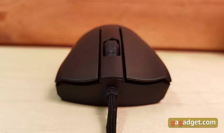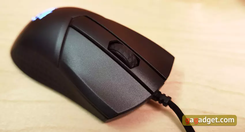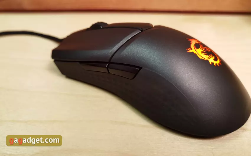 Die Seiten sind mit einer gummiartigen Beschichtung mit einem strukturierten Muster versehen, was dazu beiträgt, die Maus während des Gebrauchs sicherer zu halten. Die zusätzlichen Tasten sind glänzend, haben eine Standardform, aber die Trennung zwischen ihnen ist fast nicht spürbar.