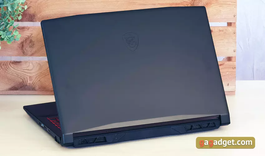 Wie auf der offiziellen Website berichtet, war der japanische Illustrator Tsuyoshi Nagano am Design des MSI Katana GF66 11UD beteiligt. Der Laptop wirkt sehr zurückhaltend und streng, im Gegensatz zu einem Haufen Gaming-Modelle mit Hintergrundbeleuchtung aus allen Ritzen. In diesem Fall gibt es nur eine Tastaturbeleuchtung. Das Gehäuse ist komplett aus praktischem mattschwarzem Kunststoff gefertigt. Es sammelt praktisch keine Fingerabdrücke. Von den dekorativen Elementen ist nur das geprägte MSI-Logo auf der oberen Abdeckung in Mode zu bemerken.